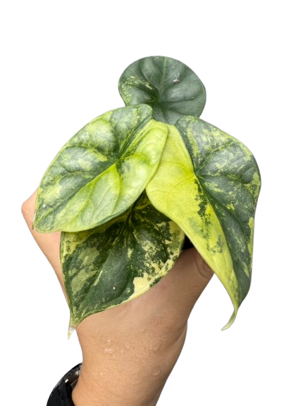 The Alocasia Silver Dragon Aurea is a true jewel in the aroid world, combining the metallic silver scales of the classic Silver Dragon with the golden variegation (Aurea) that makes every leaf shine like treasure. Its heart-shaped leaves display a striking contrast of deep green, shimmering silver, and golden-yellow patterns, making it a highly sought-after collectorโs plant.